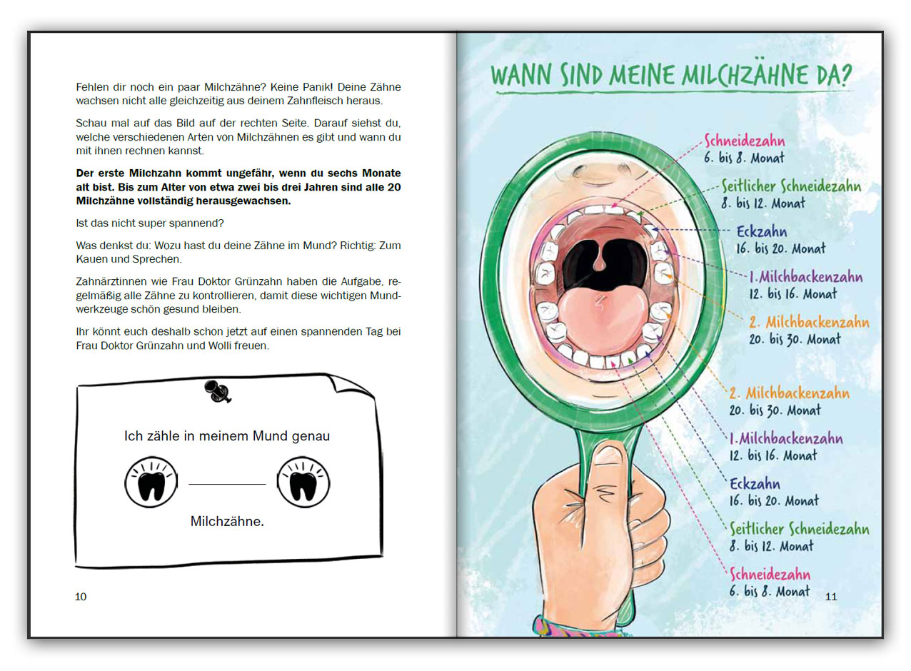 Im folgenden Buch werdet ihr und eure Eltern einiges über Milchzähne und bleibende Zähne erfahren und darüber, wie ihr sie am besten pflegen könnt. Außerdem verraten wir euch, welche Rolle die Ernährung spielt und wie ein Zahnarztbesuch abläuft. Los geht’s!