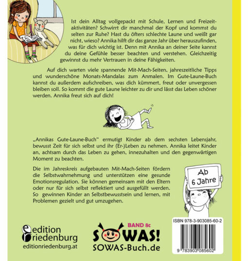 „Annikas Gute-Laune-Buch“ ermutigt Kinder ab dem sechsten Lebensjahr, bewusst Zeit für sich selbst und ihr (Er-)Leben zu nehmen. Annika leitet Kinder an, achtsam durch das Leben zu gehen, innezuhalten und den gegenwärtigen Moment zu beachten.