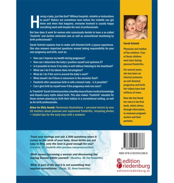 In ‘Freebirth’ Sarah Schmid provides a healthy dose of basic medical knowledge and dispels scary myths about birth. This also makes ‘Freebirth’ valuable for those women planning to birth their babies in a conventional setting, as well as for birth professionals.