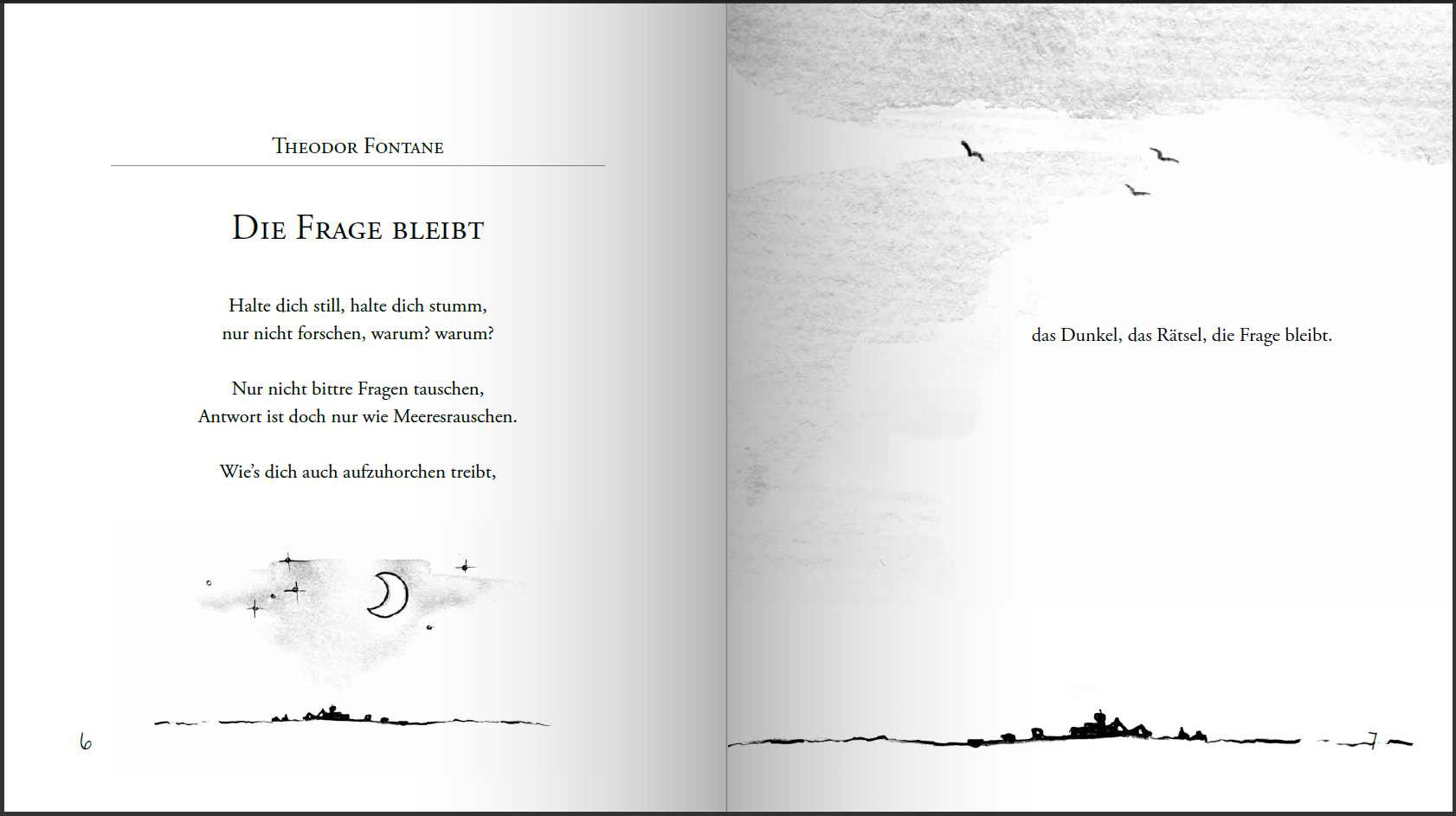 Begleitet wird die stimmungsvolle Bilderreihe mit Passagen aus „Das Dekameron“ des italienischen Dichters Giovanni Boccaccio (1313–1375). Er beschrieb während der großen Pest im Jahre 1348 sehr anschaulich die Suche nach „der besten Medizin gegen dieses Unheil“. Dem über 650 Jahre alten Text stellt Nicole Schäufler eine Auswahl neuzeitlicher Gedichte gegenüber: Theodor Fontane, Joachim Ringelnatz, Christian Morgenstern, Else Lasker-Schüler und viele andere spenden Trost in schweren Zeiten.